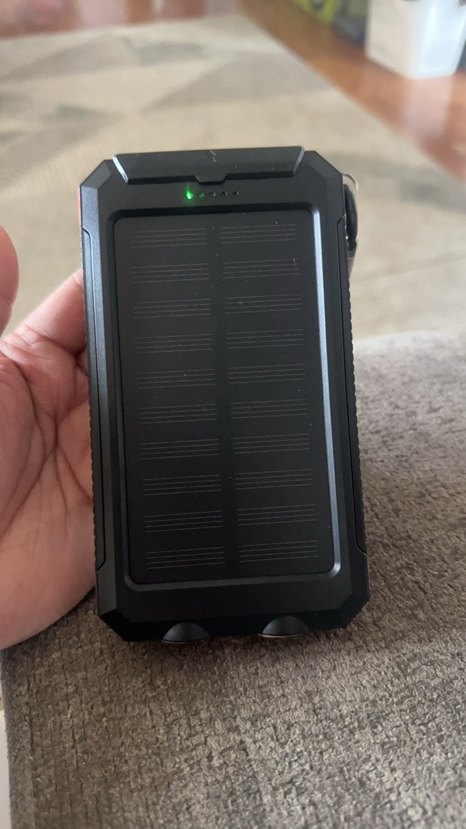 I haven't charged it in the sun yet but I've charged it through the outlet. It can charge 2 phones at once & has slots for old & new plugs. The lights are super bright & it's very lightweight. Well worth the money. Especially good to have for long unpredictable New England winters. Thanks Temu!